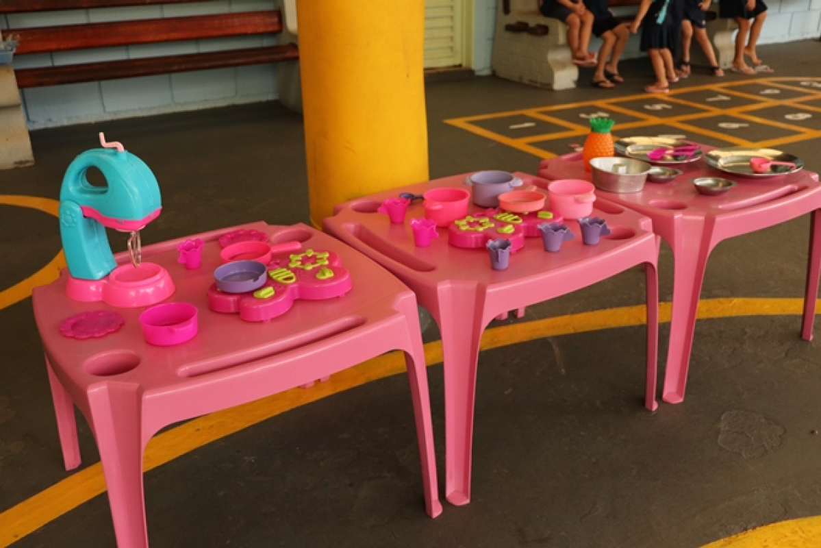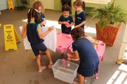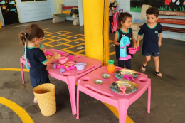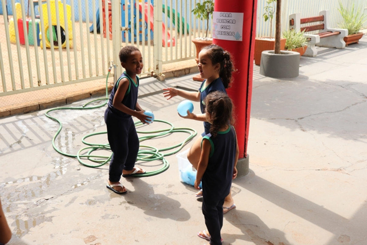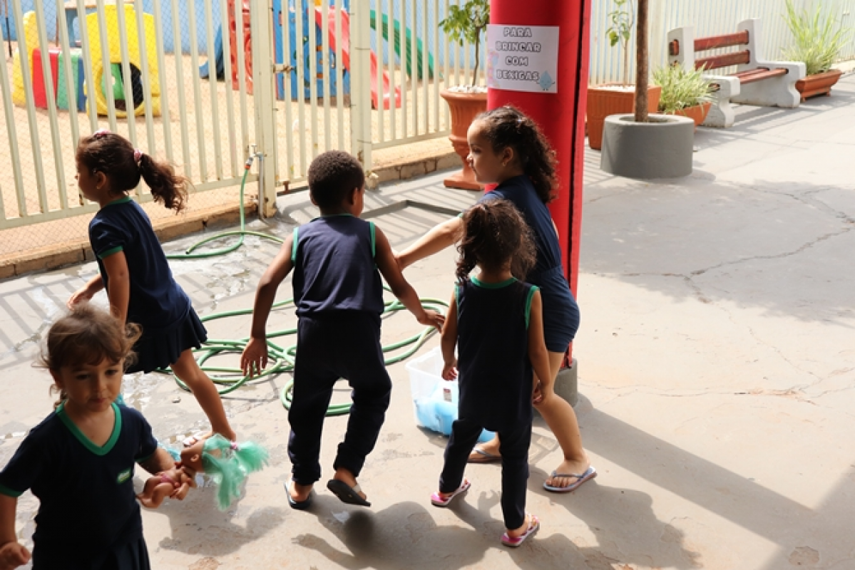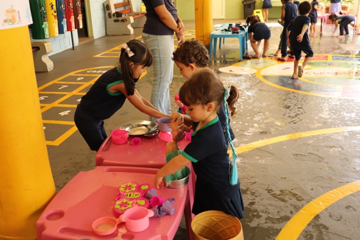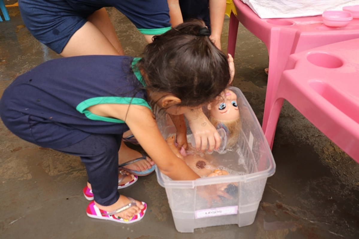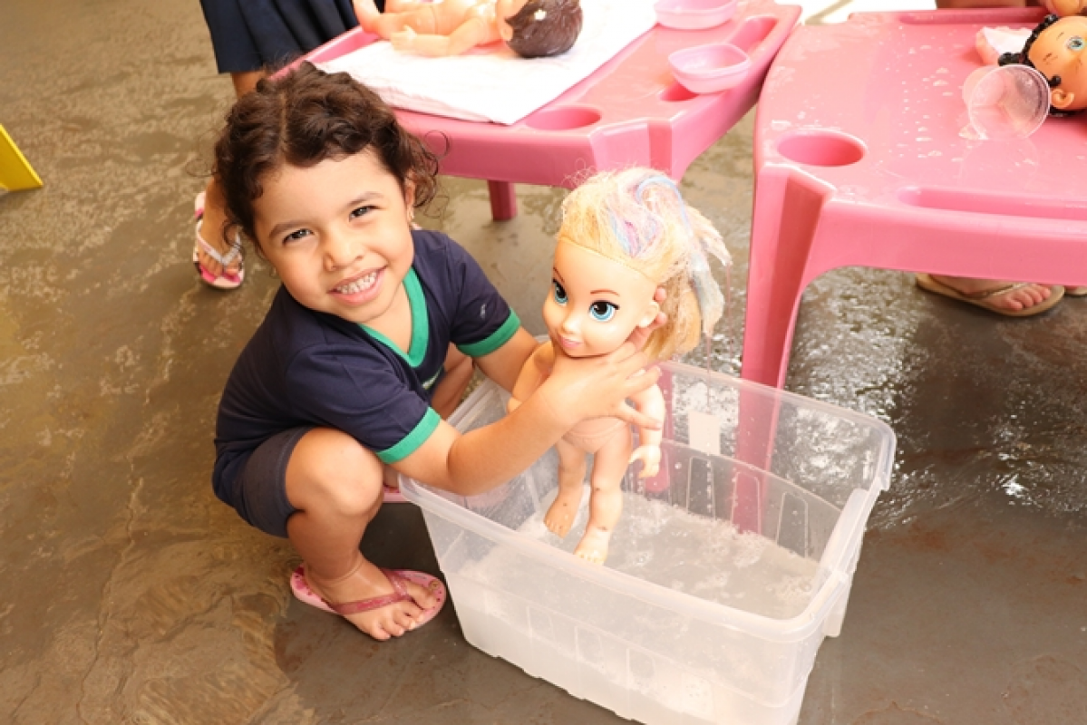 Organizadas pelas professoras Tailine e Letícia, as ações aconteceram em diferentes espaços preparados no pátio da escola, com dinâmicas que estimularam o aprendizado por meio da brincadeira. Entre as atividades, as crianças participaram de momentos como dar banho em bonecos, lavar carrinhos, brincar em uma minicozinha e com bexigas cheias de água. A escola também estava decorada com painéis temáticos com desenhos feitos pelos alunos.