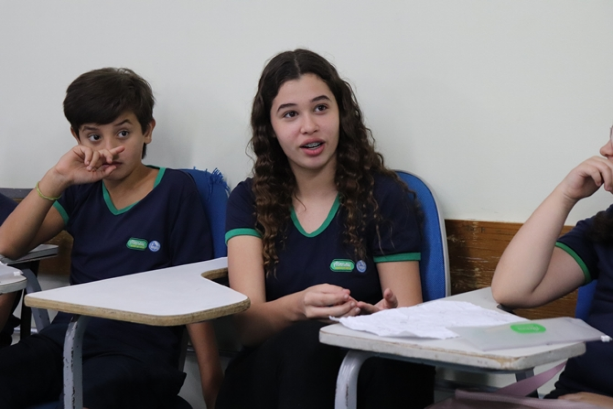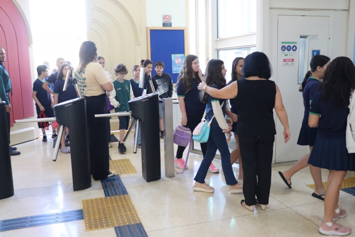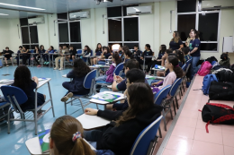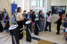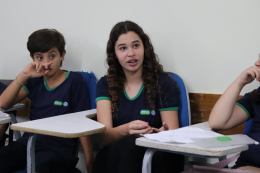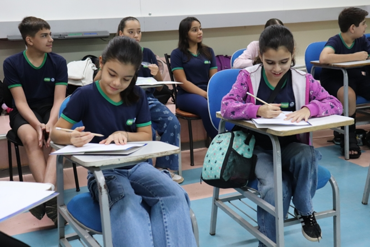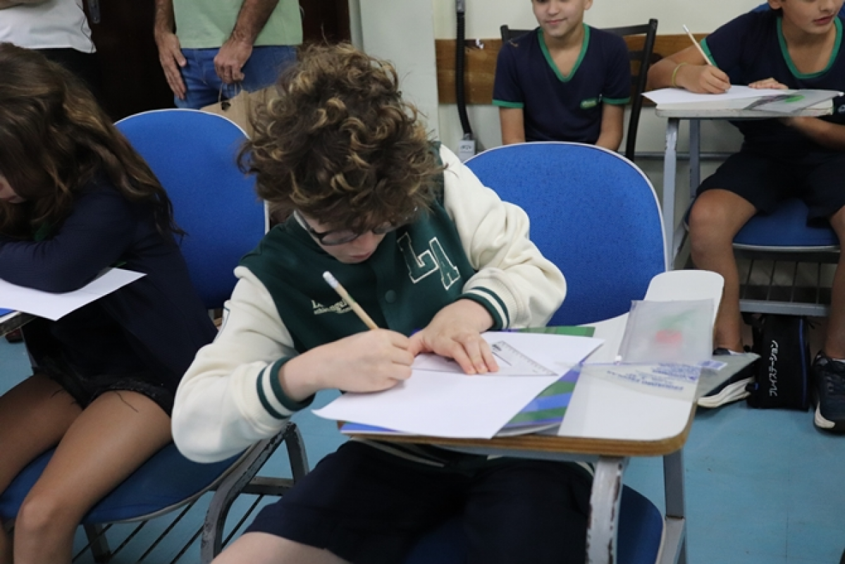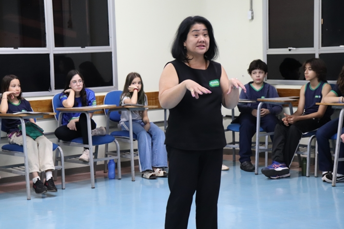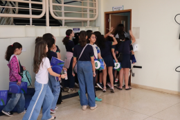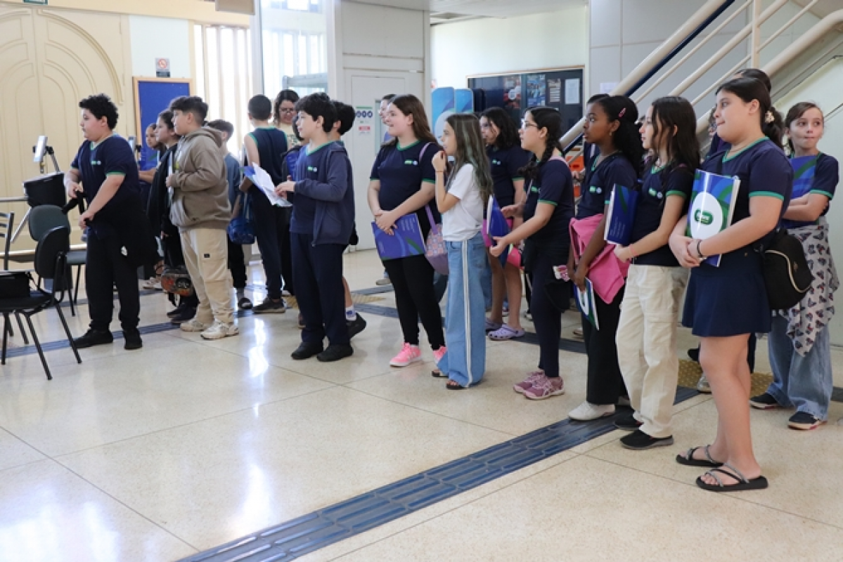 No primeiro dia, os alunos do 5º ano se reuniram com colegas do 6º ano, no prédio do Ensino Fundamental II e Médio, para começar a conhecer a nova fase escolar. O encontro inicial foi uma aula ministrada pela professora Maria Regina Suavinha, sobre Educação Socioemocional e resiliência. Em seguida, a docente conduziu os alunos em uma visita às instalações da escola, como a sala de artes e robótica.