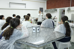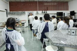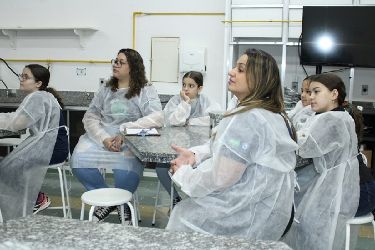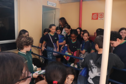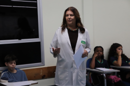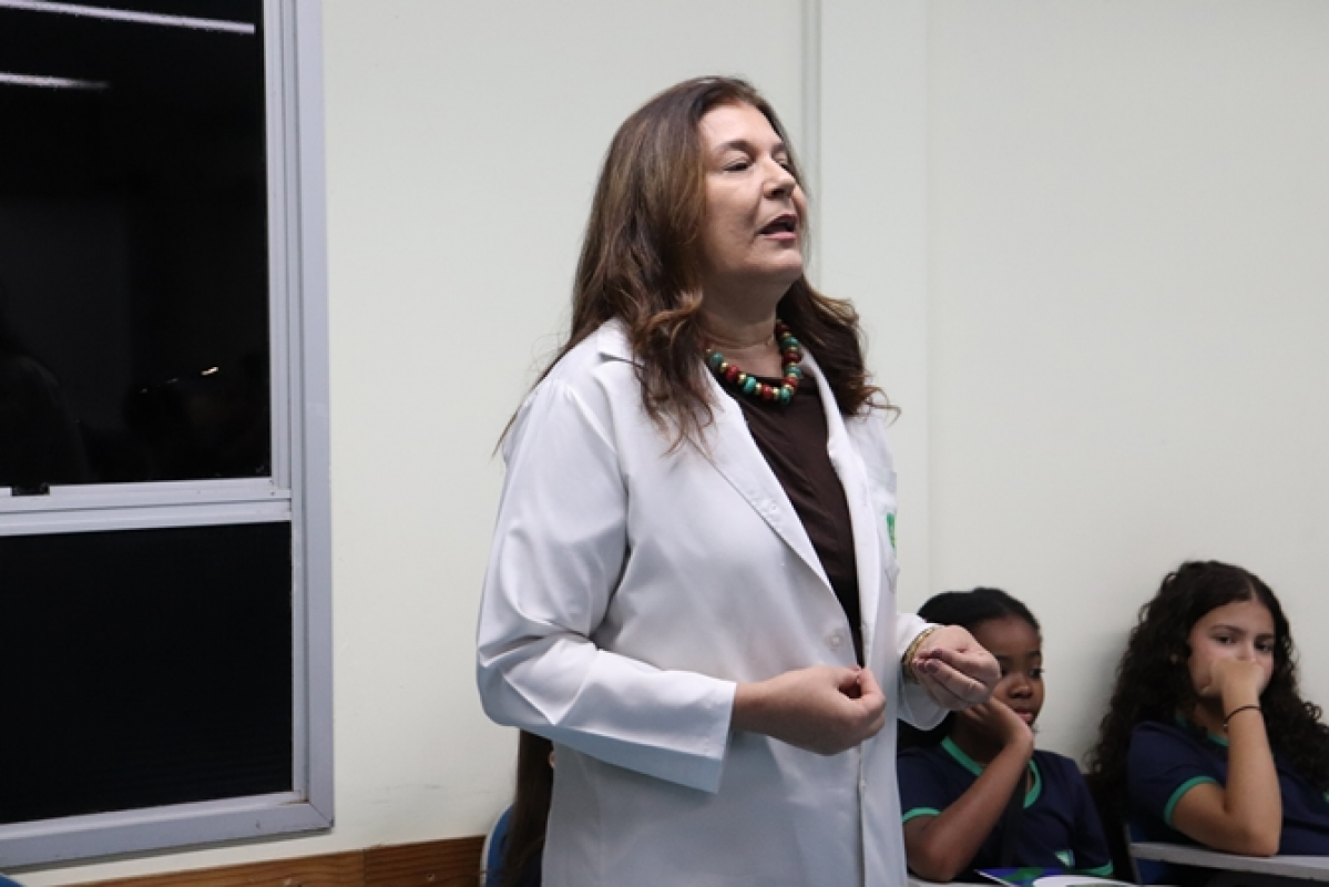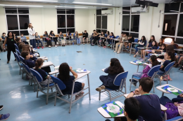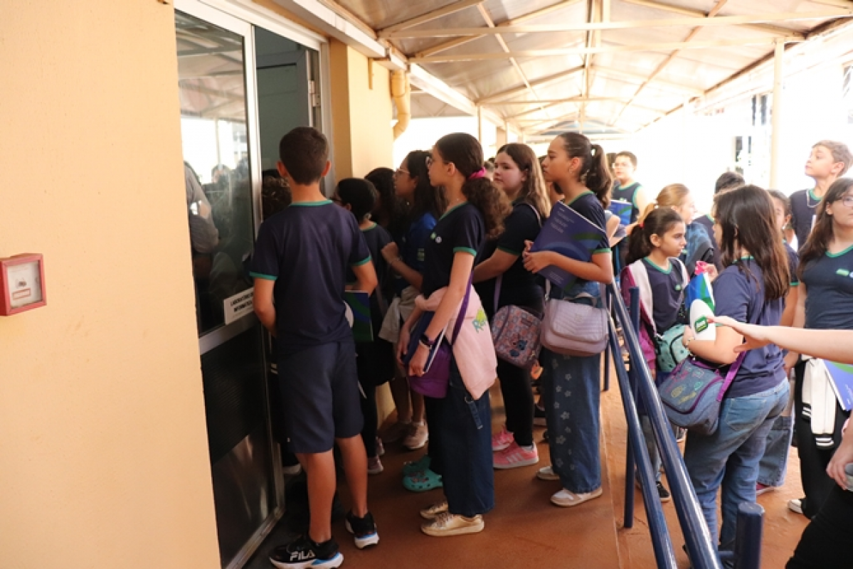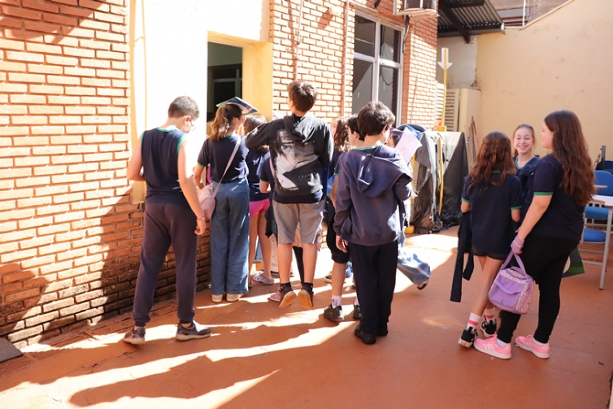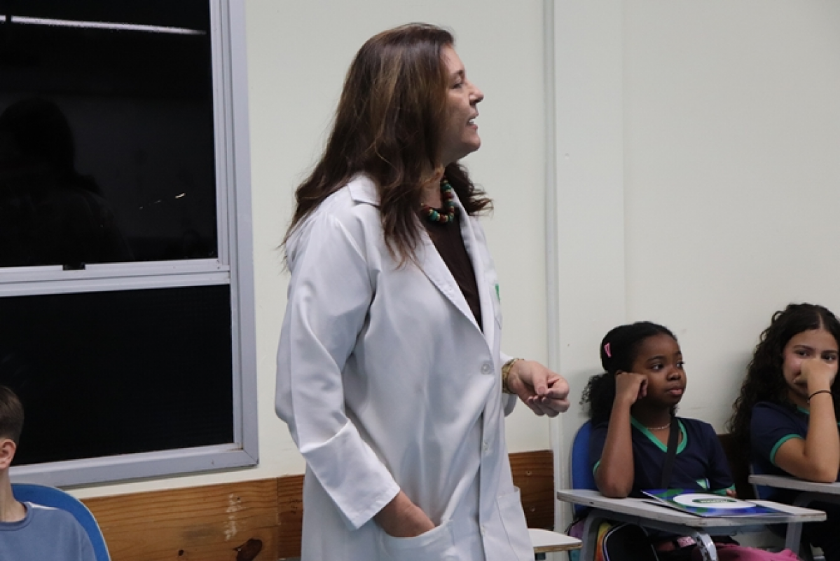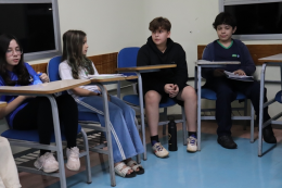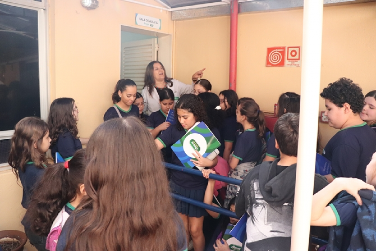 No primeiro dia, os alunos do 5º ano se reuniram com colegas do 6º ano, no prédio do Ensino Fundamental II e Médio, para começar a conhecer a nova fase escolar. O encontro inicial foi uma aula ministrada pela professora Maria Regina Suavinha, sobre Educação Socioemocional e resiliência. Em seguida, a docente conduziu os alunos em uma visita às instalações da escola, como a sala de artes e robótica.