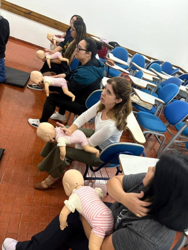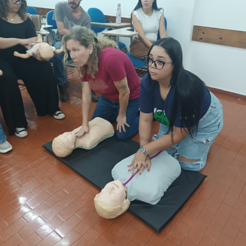 Durante a capacitação, todos aprenderam técnicas essenciais para agir em situações de emergência, como engasgos, quedas, convulsões e parada cardiorrespiratória, com foco na segurança e bem-estar dos estudantes.